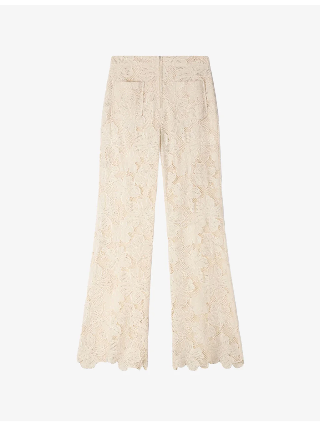 PRODUCT DETAILS - Sandro lace trousers - 66% polyester, 32% cotton, 2% polyamide - Zip fastening - Regular fit, high-rise, flared leg, side pockets, short lining - Dry clean - True to size - Model is 5ft 9in/1.75m and wears a size UK 8 - Lightweight, non-stretch Ref: R04598470