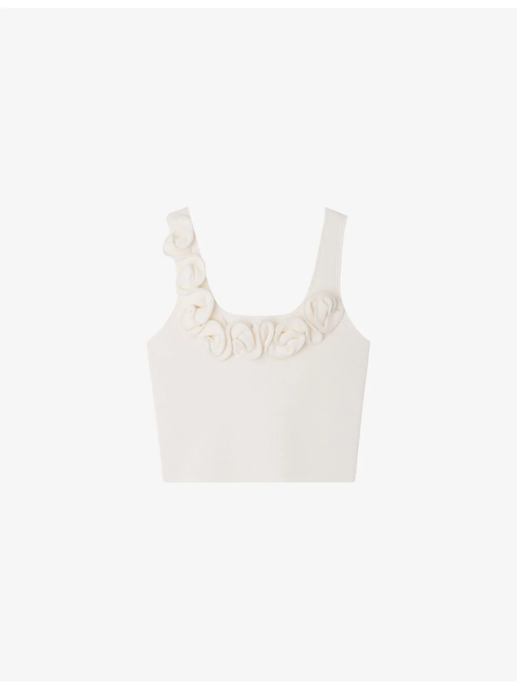 PRODUCT DETAILS - Sandro knitted top - 55% polyamide, 43% viscose, 2% elastane - Regular fit, scoop-neck, sleeveless, flower-shaped embellishments, cropped - Dry clean - True to size - Model is 5ft 9in/1.75m and wears a size UK 8 - Lightweight, slight stretch Ref: R04598552