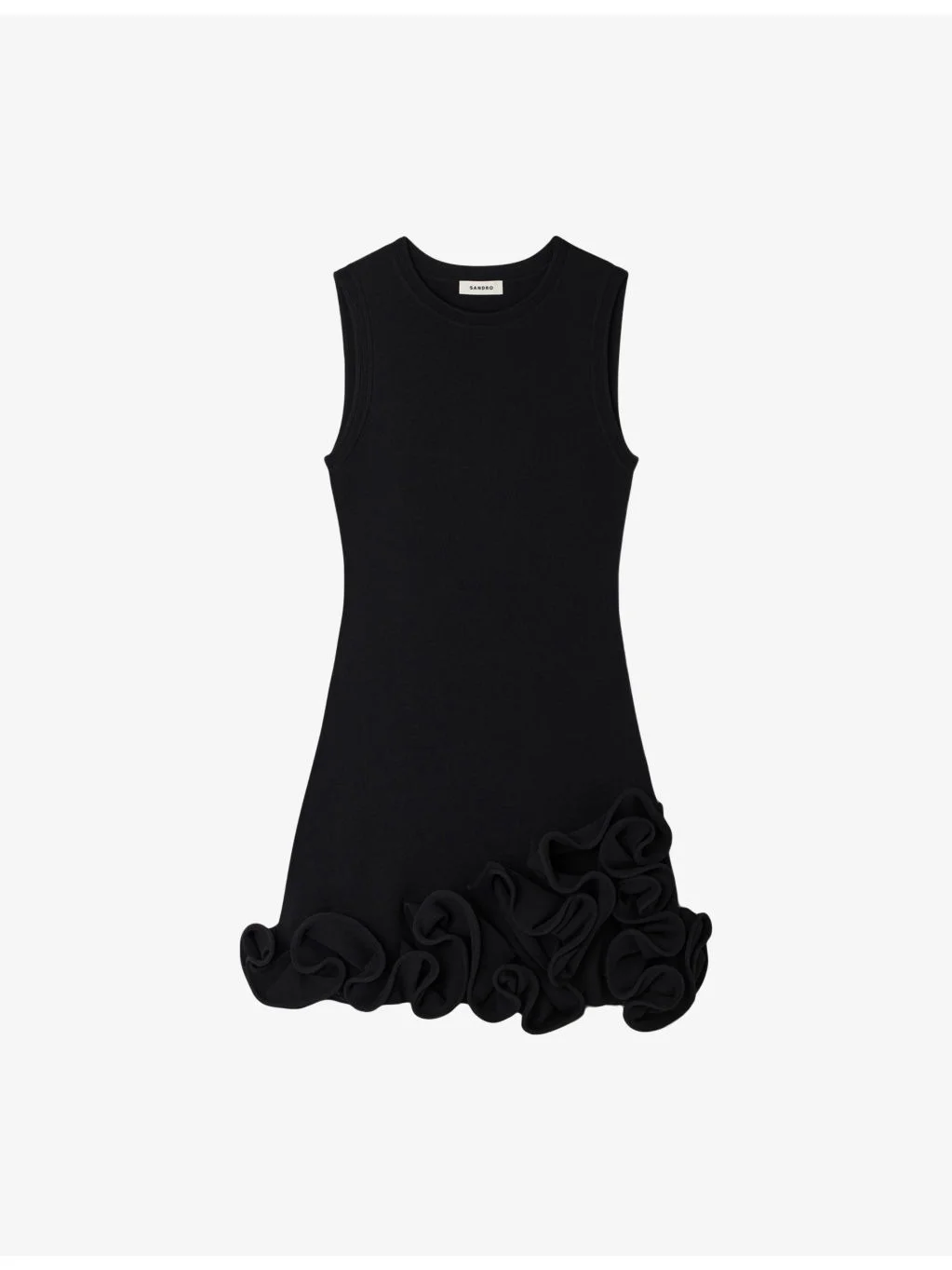 PRODUCT DETAILS - Sandro knitted mini dress - 56% polyamide, 41% viscose, 3% elastane - Slim fit, round-neck, sleeveless, flower-shaped embellishments to hem - Dry clean - True to size - Model is 5ft 9in/1.75m and wears a size UK 8 - Lightweight, slight stretch Ref: R04598559