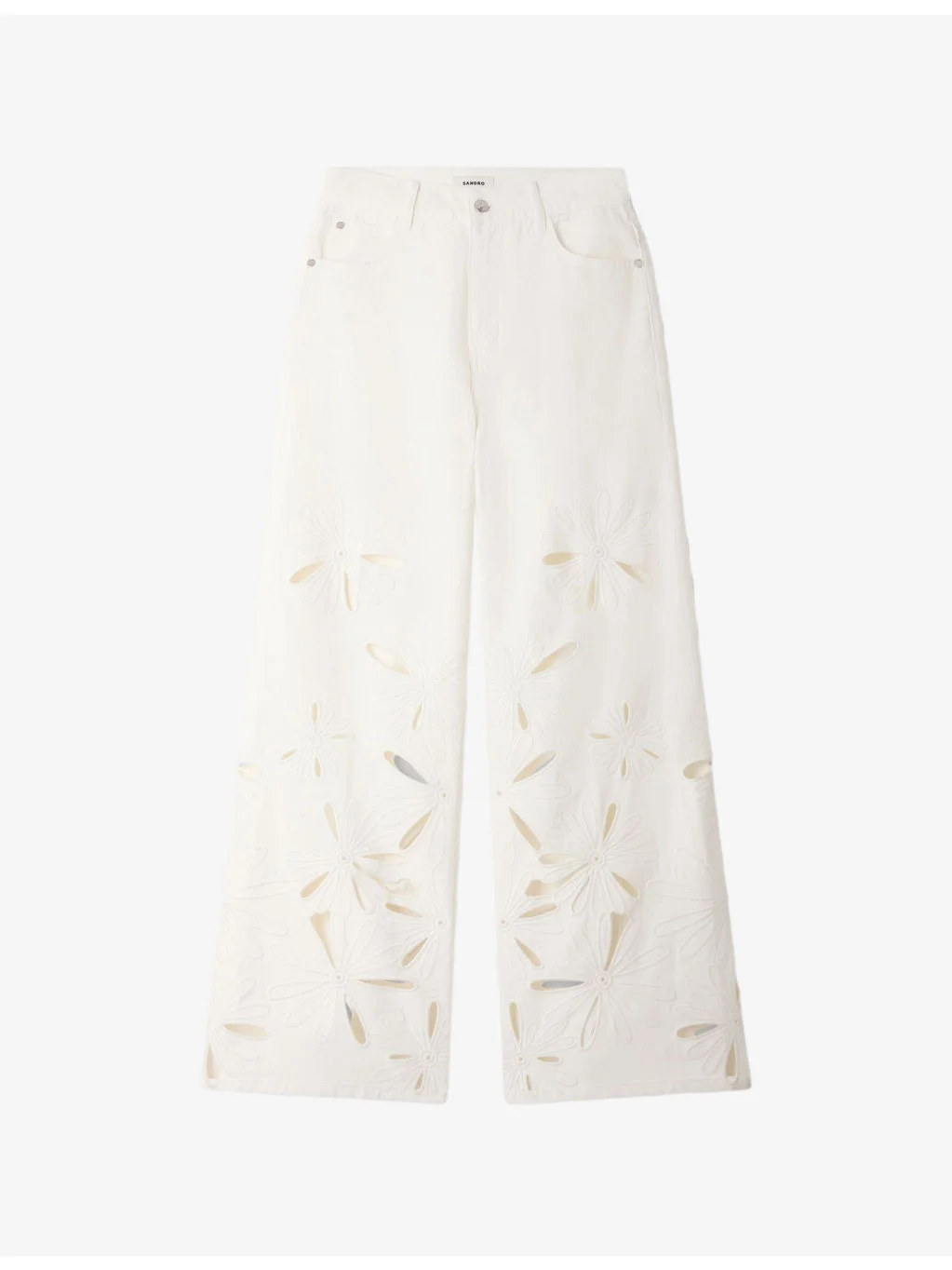 PRODUCT DETAILS - Sandro denim jeans - 100% cotton - Button and zip-fly fastening - Regular fit, mid-rise, wide-leg, belt loops, side pockets, back pockets, cut-out embroidered flowers - Machine wash mild - True to size - Model is 5ft 9in/1.75m and wears a size UK 8 - Lightweight, non-stretch Ref: R04598529