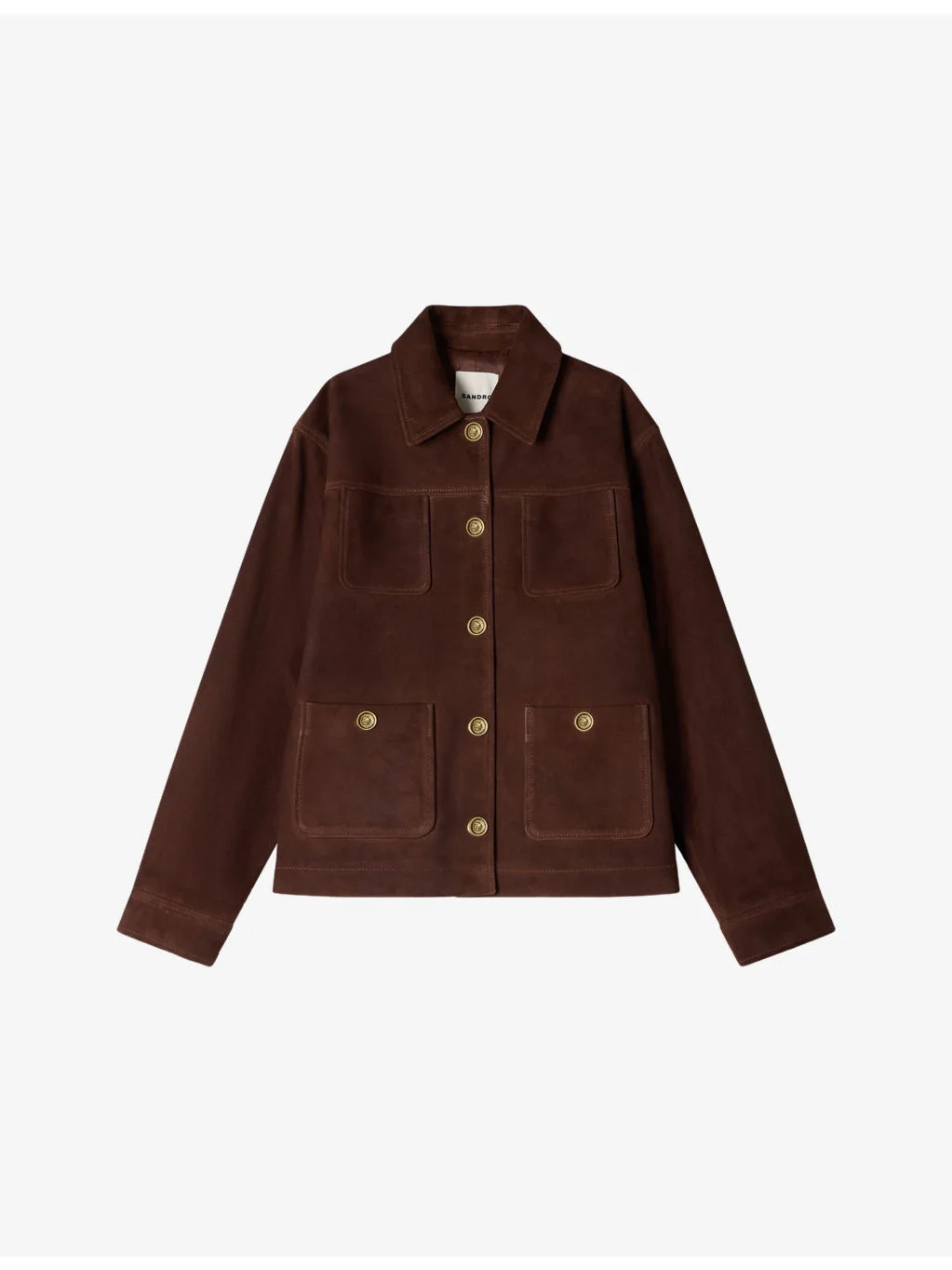 PRODUCT DETAILS - Sandro suede jacket - 100% suede - Button fastening - Regular fit, collar, long sleeves, chest pockets, side pockets - Specialist leather clean - True to size - Model is 5ft 10in/1.78m and wears a size UK 8 - Heavyweight, non-stretch Ref: R04598318