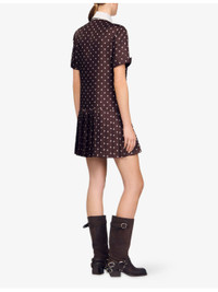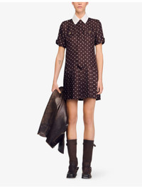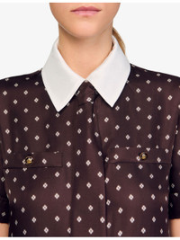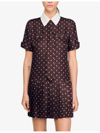 PRODUCT DETAILS - Sandro satin mini dress - 100% polyester - Concealed button fastening at front - Regular fit, contrast collar, short sleeves, all-over geometric print, printed necktie, two mock welt pockets at chest, gold-toned button embellishments at pockets, folded cuffs, pleated skirt, mini length, satin texture - Dry clean only - True to size - Lightweight, non-stretch Ref: R04490672