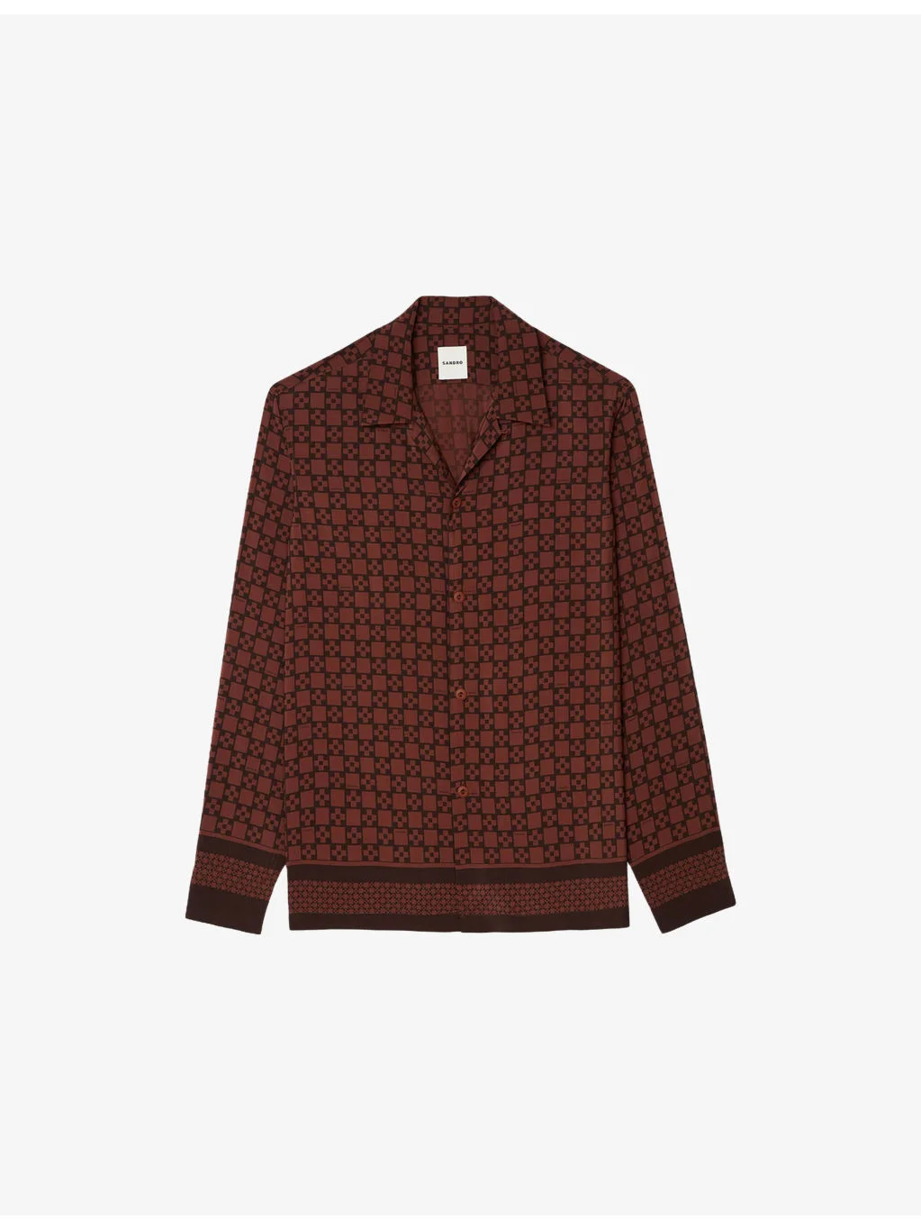 PRODUCT DETAILS - Sandro woven shirt - 100% viscose - Exposed button fastening at front - Relaxed fit, camp collar, long sleeves, dropped shoulders, all-over geometric print, all-over brand print, contrast trim to cuffs and hem - Dry clean only - Model is 6ft 2in/1.88m and wears a size medium - Lightweight, non-stretch Ref: R04501109