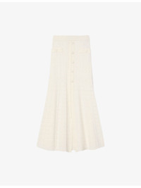 PRODUCT DETAILS - Sandro knitted maxi skirt - 53% viscose, 45% polyamide, 2% elastane - Slips on - Regular fit, high-rise, side pockets, split hem, all-over pointelle texture, branded decorative buttons - Hand wash - True to size - Model is 5ft 9in/1.75m and wears a size UK 8 - Lightweight, slight stretch Ref: R04490586