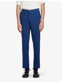 PRODUCT DETAILS - Sandro stretch-jersey trousers - 68% polyester, 28% viscose, 4% elastane - Exposed button and concealed zip-fly fastenings at front - Slim fit, mid rise, tapered leg, elasticated waistband, slip pockets at sides, pressed centre creases at front and back, two welt pockets at back - Dry clean only - Size 32: Rise 10.5in / 26cm, inside leg 32in / 81cm, leg opening 14in / 35cm - Model is 6ft 1in/1.85m and wears a size UK 32 - Midweight, stretchy Ref: R03630704
