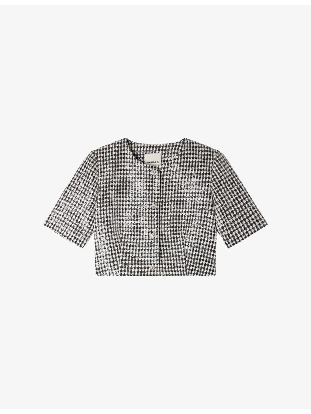 PRODUCT DETAILS - Sandro woven jacket - 75% polyester, 12% acrylic, 5% polyamide, 5% viscose, 2% wool, 1% other fibres; lining 100% polyester; sequins 100% polyester - Exposed button fastening at front - Round neck, short sleeves, all-over print, sequins finish, cropped length - Dry clean - Made in Tunisia - Model is 5ft 11in/1.80m and wears a size UK 8 - Lightweight, slight stretch Ref: R04578703
