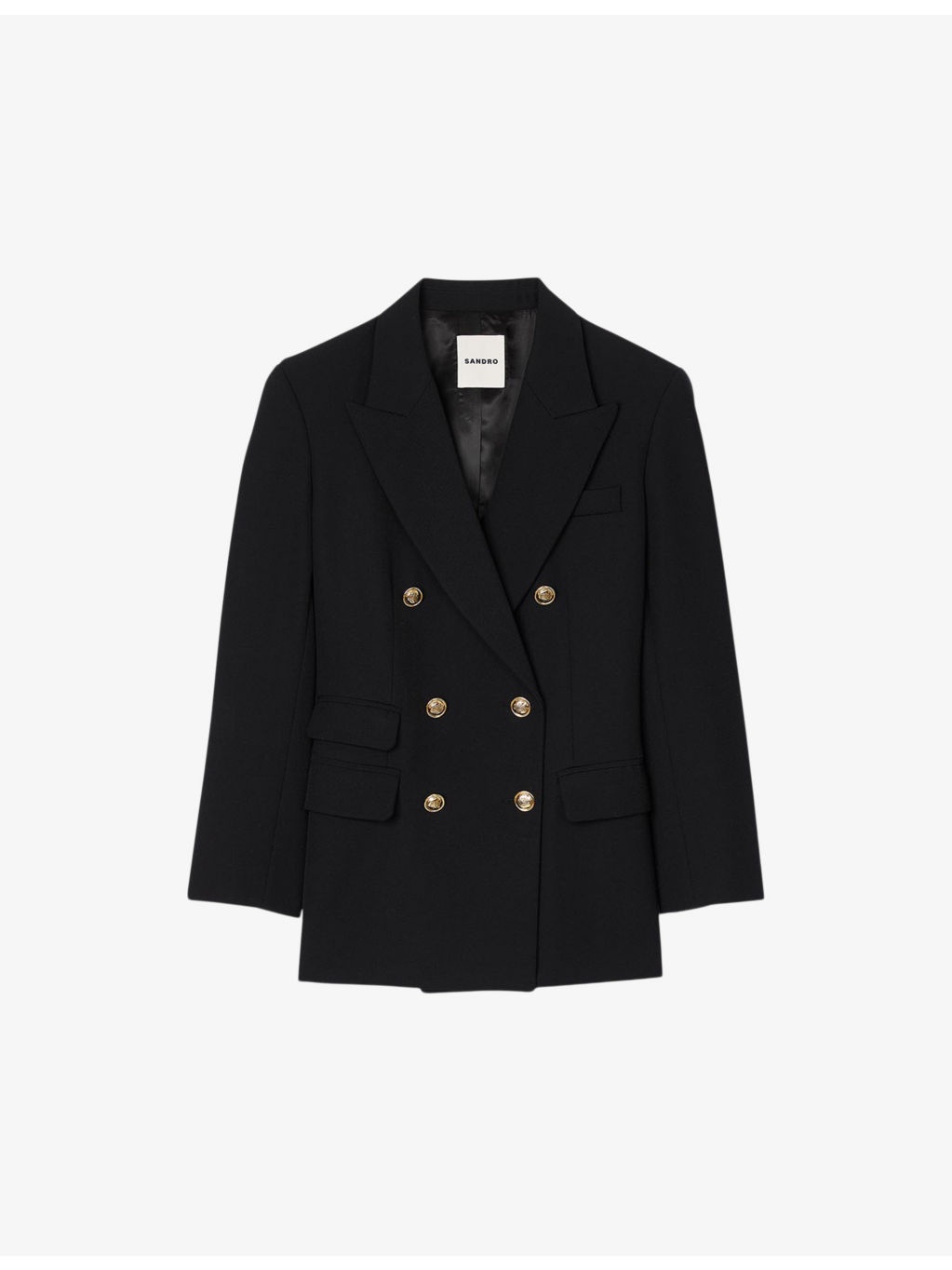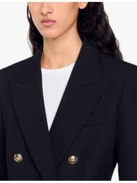 PRODUCT DETAILS - Sandro wool-blend blazer - 55% polyester, 45% virgin wool - Exposed button fastening at front - Slim fit, lapel collar, long sleeves, two flap pockets at the side, gold-tone hardware - Dry clean - True to size - Model is 5ft 9in/1.75m and wears a size UK 8 - Midweight, non-stretch Ref: R04320900