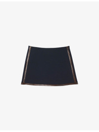 PRODUCT DETAILS - Sandro stretch-woven mini skirt - 64% polyester, 34% viscose, 2% elastane; trim 100% leather; lining 100% viscose - Concealed zip fastening at back - Regular fit, high waist, leather trims to sides and hem, side pocket opening, straight cut, mini length, lined - Dry clean only - True to size - Model is 5ft 9in/1.75m and wears a size UK 8 - Lightweight, slight stretch Ref: R04501125