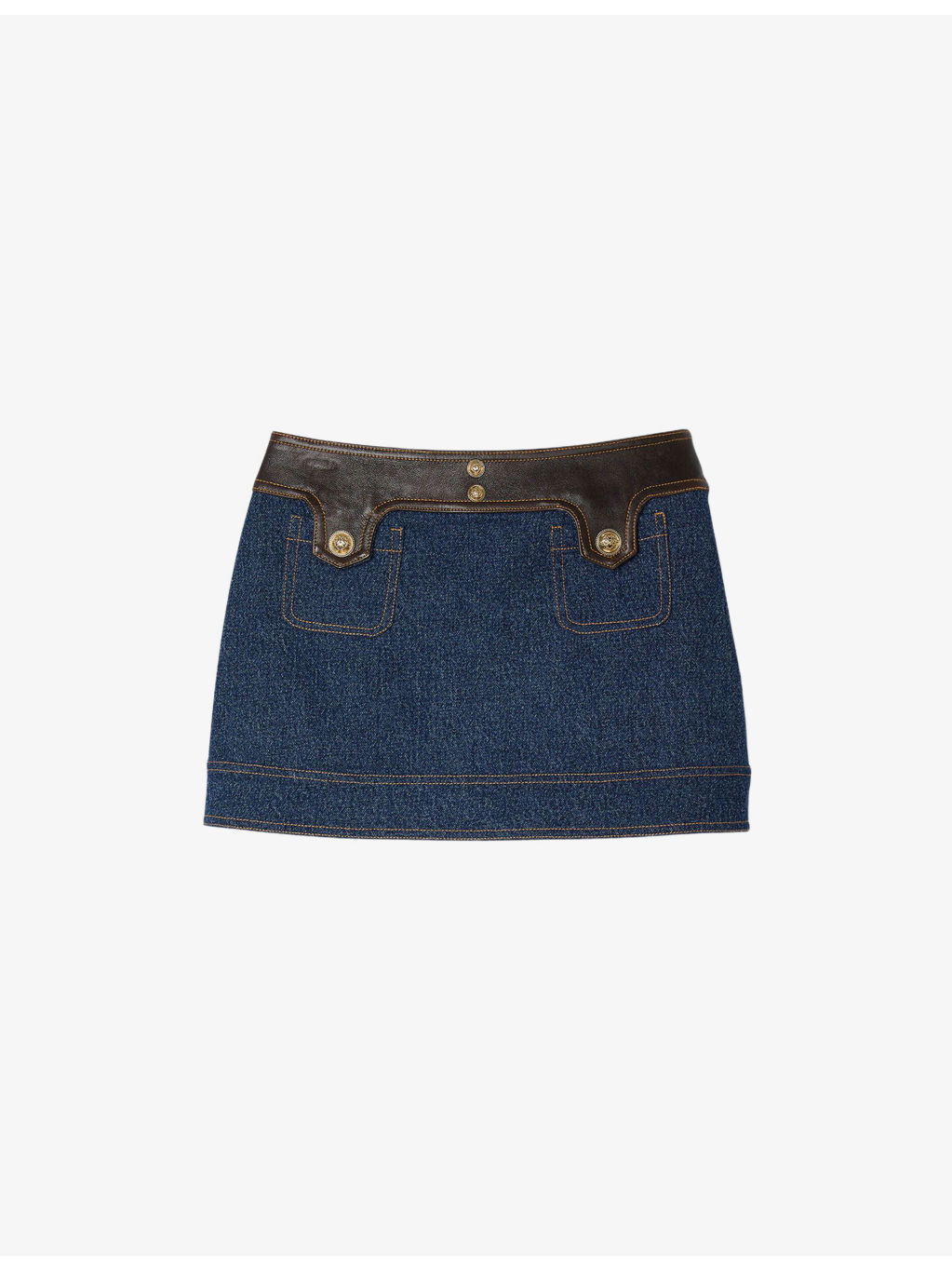PRODUCT DETAILS - Sandro denim and leather skirt - 100% cotton - Exposed button fastening at front - Slim fit, mid-rise, leather button-waist design, two pockets at the side, gold-tone hardware - Machine wash at 30°C - True to size - Model is 5ft 8in/1.77m and wears a size UK 8 - Midweight, non-stretch Ref: R04490621