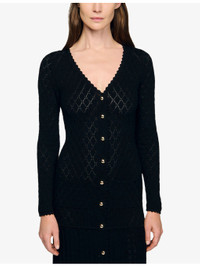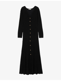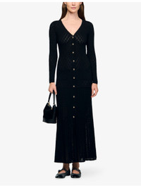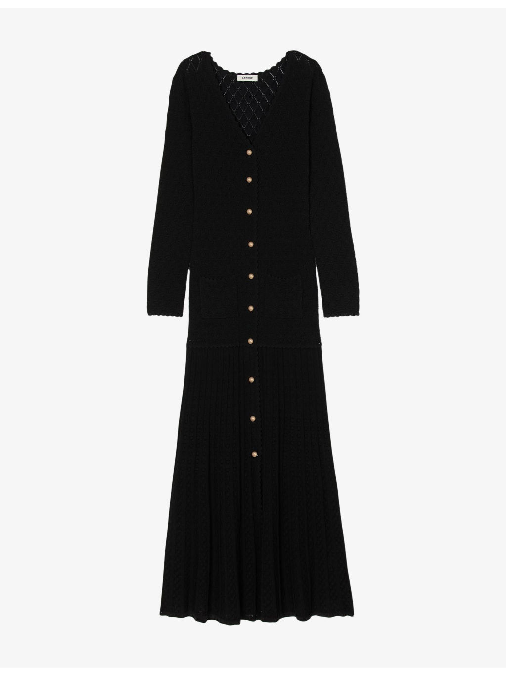 PRODUCT DETAILS - Sandro knitted maxi dress - 55% viscose, 43% polyamide, 2% elastane - Button fastening - Regular fit, V-neckline, long sleeves, open textured knit, flared pleat hem - Machine wash cold - True to size - Model is 5ft 9in/1.75m and wears a size UK 8 - Lightweight, stretchy Ref: R04490623