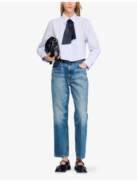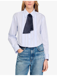 PRODUCT DETAILS - Sandro cotton shirt - 100% cotton - 100% cotton; bow 100% viscose - Pointed collar, long sleeves, buttoned cuffs, removable contrasting tie, all-over striped detailing, curved hem, cropped length - Dry clean - Made in Tunisia - True to size - Lightweight, non-stretch Ref: R04490679
