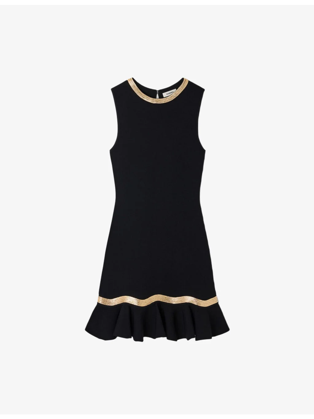 PRODUCT DETAILS - Sandro knitted mini dress - 54% viscose, 44% polyamide, 2% elastane - Slim fit, round-neck, sleeveless, flared ruffle hem, metallic trim - Hand wash - True to size - Model is 5ft 9in/1.75m and wears a size UK 8 - Lightweight, slight stretch Ref: R04618225