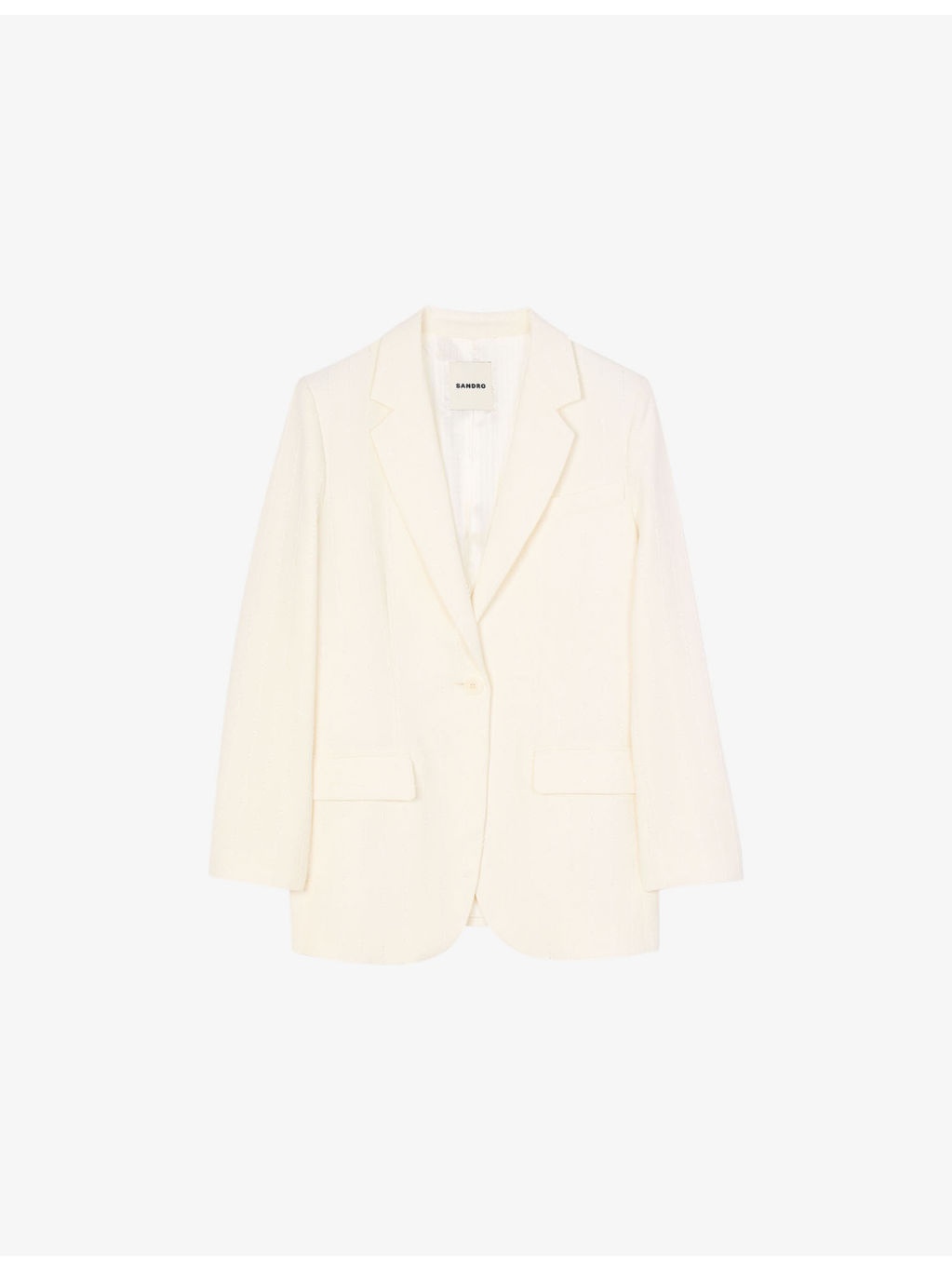 PRODUCT DETAILS - Sandro woven blazer - 95% viscose, 3% polyamide, 2% polyester; lining 100% viscose - Exposed button fastenings at front - Regular fit, notched lapels, long sleeves, buttoned cuffs, welt pockets at chest, single breasted, two flap pockets at front, lined, single vent at back, all-over sequin stripes - Specialist dry clean - True to size - Midweight, non-stretch Ref: R04411949