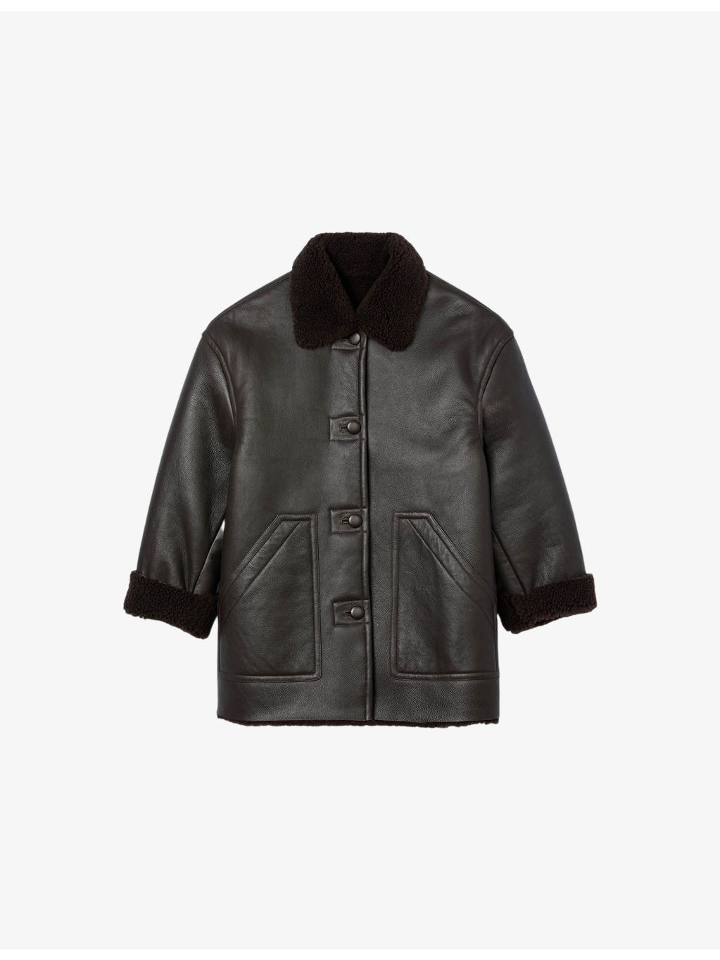 PRODUCT DETAILS - Sandro shearling coat - 100% shearling - Exposed button fastening at front - Boxy fit, shearling collar, long sleeves, dropped shoulders, shearling cuffs, covered buttons, two slanted patch pockets at sides, shearling lining - Specialist leather clean - True to size - Model is 5ft 9in/1.75m and wears a size UK 8 - Heavyweight, non-stretch Ref: R04490649