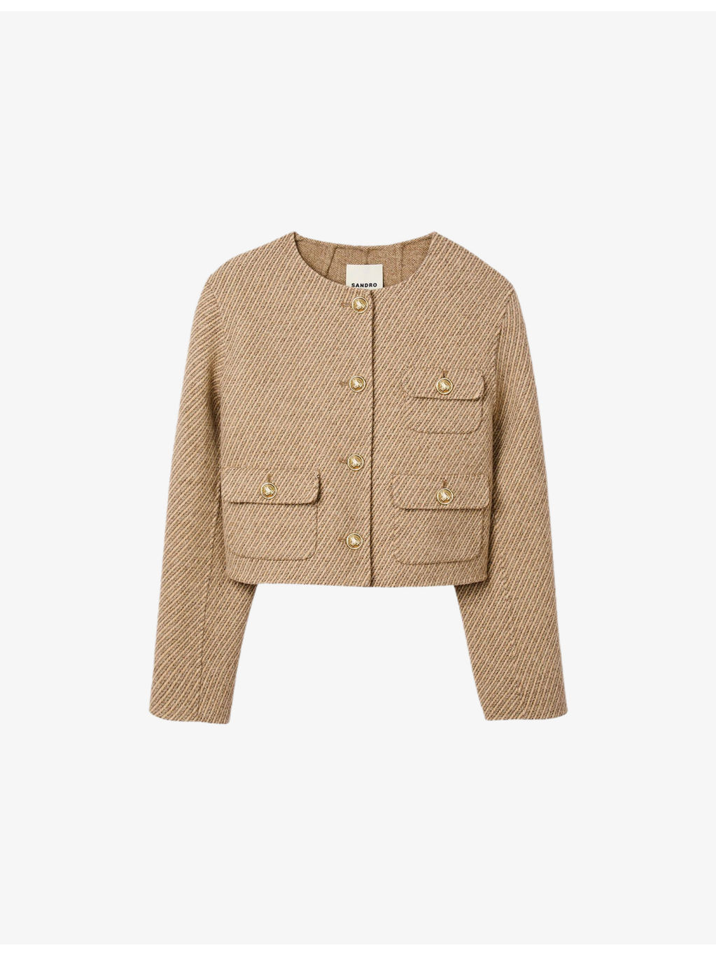PRODUCT DETAILS - Sandro wool-blend jacket - 70% wool, 30% polyester - Exposed button fastening at front - Regular fit, round neck, one patch pocket at the chest, two patch pockets at the side, long sleeves, gold-tone hardware, cropped - Dry clean - True to size - Model is 5ft 10in/1.78m and wears a size UK 8 - Midweight, non-stretch Ref: R04324570