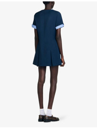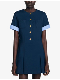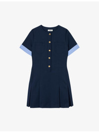 PRODUCT DETAILS - Sandro stretch-woven mini dress - 91% polyester, 9% elastane; main lining 100% polyester - Exposed button fastening at front - Regular fit, round neck, short sleeves, gold-toned buttons, two patch pockets at chest, contrasting checked trim to cuffs, pleated skirt, mini length - Dry clean - True to size - Midweight, slight stretch Ref: R04490581
