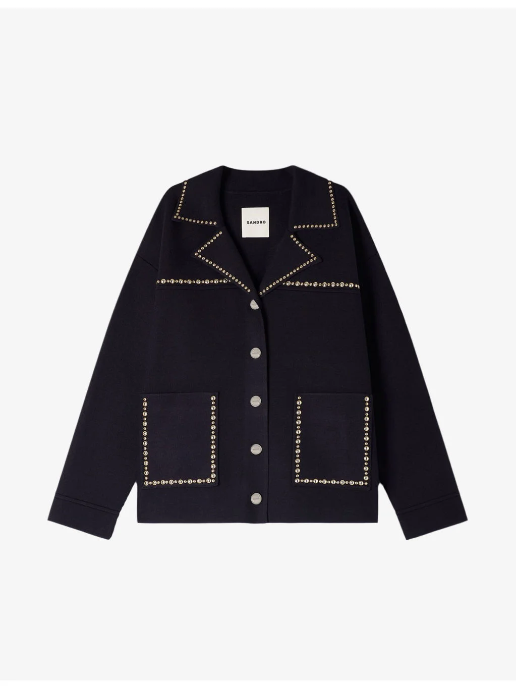 PRODUCT DETAILS - Sandro knitted cardigan - 51% viscose, 28% polyester, 21% polyamide - Pressed stud fastening - Relaxed fit, notch lapels, long sleeves, side pockets, studded trim - Hand wash - True to size - Model is 5ft 9in/1.75m and wears a size UK 8 - Midweight, slight stretch Ref: R04578813