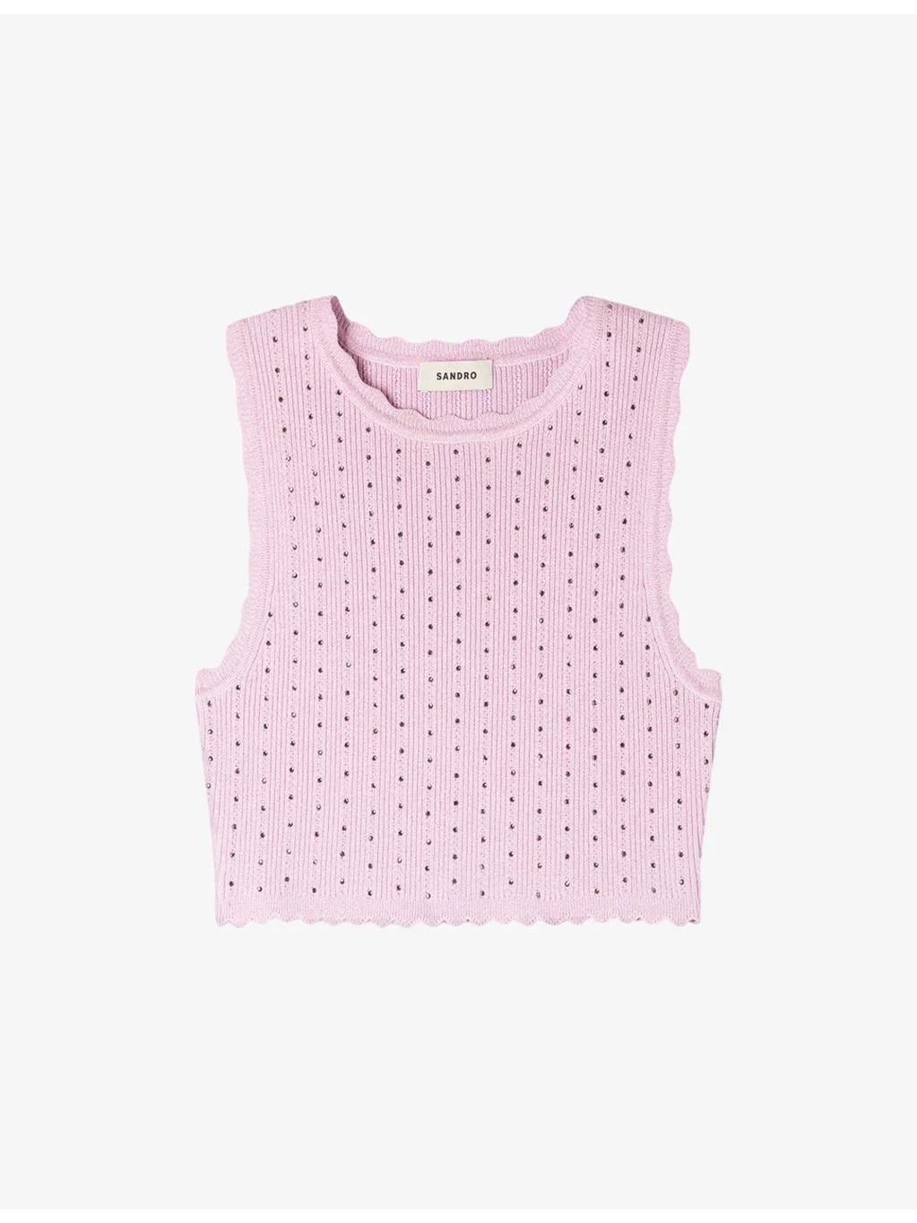PRODUCT DETAILS - Sandro knitted top - 61% viscose, 34% polyamide, 4% metalised fibres, 1% elastane - Regular fit, round-neck, sleeveless, cropped, all-over rhinestone embellishment - Hand wash - True to size - Model is 5ft 11in/1.80m and wears a size UK 8 - Lightweight, slight stretch Ref: R04598459