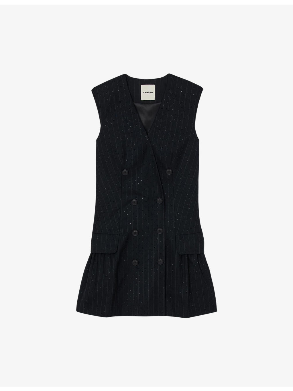 PRODUCT DETAILS - Sandro stretch wool-blend dress - 40% wool, 29% polyester, 28% viscose, 3% elastane - Exposed button fastening at front - Double breasted silhouette, V-neck, sleeveless, all-over rhinestone embellishment and stripes, two flap pockets at the side - Dry clean - True to size - Model is 5ft 9in/1.75m and wears a size UK 8 - Midweight, slight-stretch Ref: R04501164