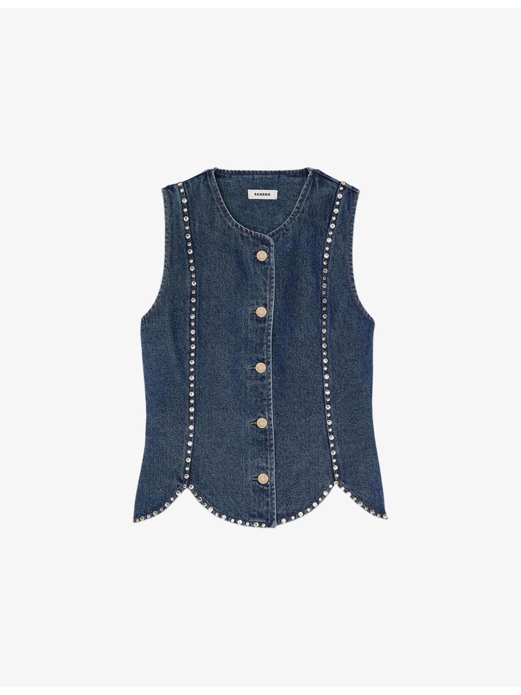 PRODUCT DETAILS - Sandro denim top - 100% cotton - Exposed button fastening at front - Slim fit, round neck, sleeveless, button-down design, rhinestone embellishment - Machine wash at 30°C - True to size - Model is 5ft 8in/1.77m and wears a size UK 8 - Midweight, non-stretch Ref: R04490530