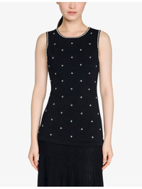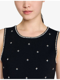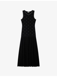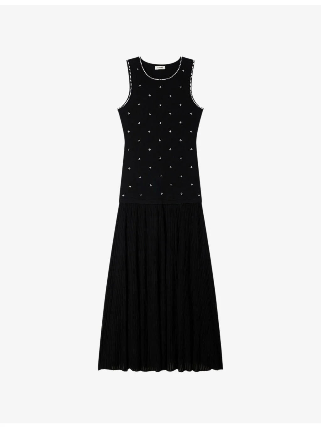 PRODUCT DETAILS - Sandro knitted maxi dress - 55% viscose, 26% polyester, 17% polyamide, 2% elastane - Regular fit, round-neck, sleeveless, rhinestone embellishment to bodice, pleated skirt - Hand wash - True to size - Model is 5ft 9in/1.75m and wears a size UK 8 - Lightweight, slight stretch Ref: R04578768