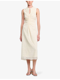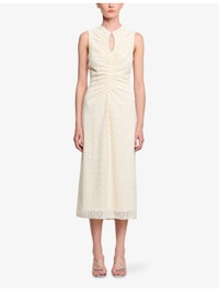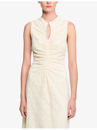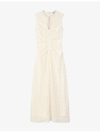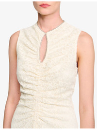 PRODUCT DETAILS - Sandro lace dress - 100% polyester - Exposed zip fastening at back - Slim fit, round neck, rhinestone-embellished trim, cut-out detail at the neck, sleeveless, ruched waist, all-over lace overlay - Dry clean - True to size - Model is 5ft 8in /1.73m and wears a size 8 - Lightweight, non-stretch Ref: R04490613
