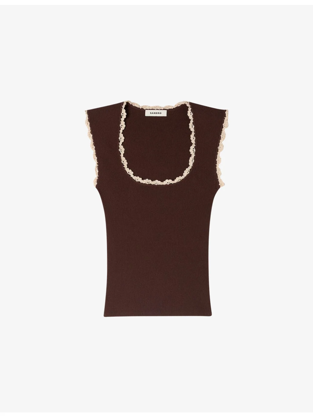 PRODUCT DETAILS - Sandro knitted top - 84% viscose 16% polyester - Slim fit, round neck with crochet trim, ribbed - Hand wash - True to size - Model is 5ft 11in/1.80m and wears a size UK 8 - Midweight, slight stretch Ref: R04598558