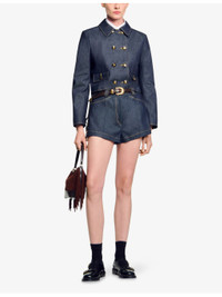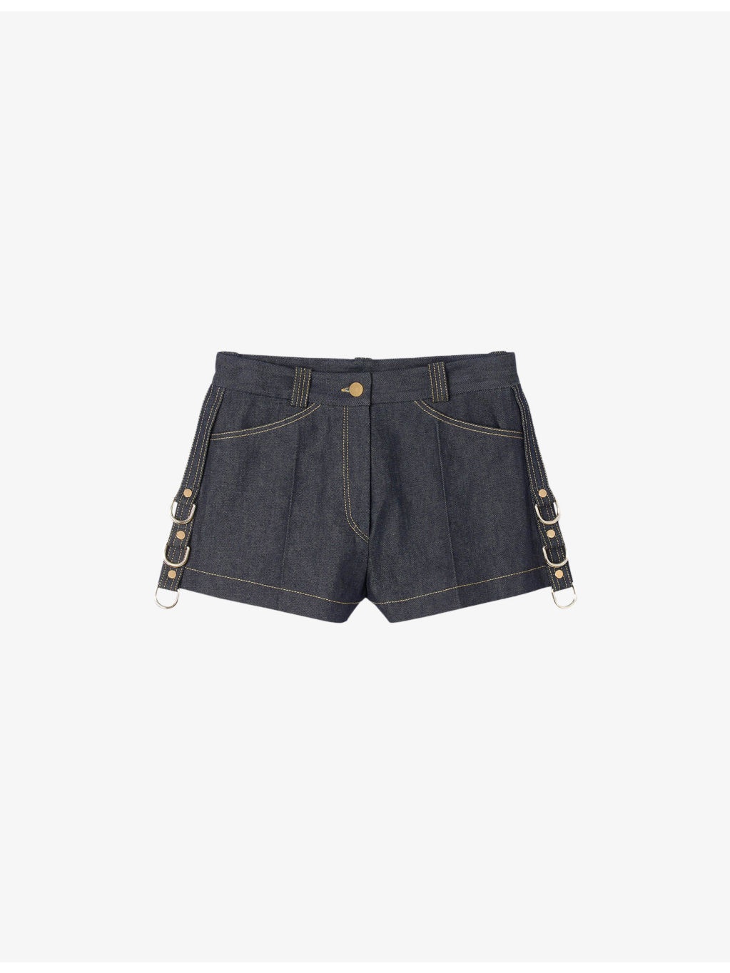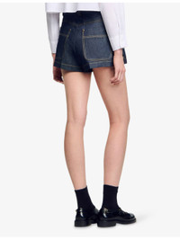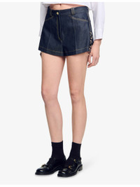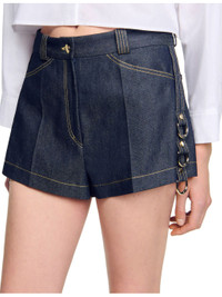 PRODUCT DETAILS - Sandro denim shorts - 100% cotton - Button and zip-fly fastening - Regular fit, mid-rise, belt loops, side pockets, back pockets, contrast stitching, rivet and ring embellishment - Dry clean - True to size - Model is 5ft 9in/1.75m and wears a size UK 8 - Midweight, non-stretch Ref: R04490580