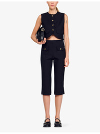 PRODUCT DETAILS - Sandro stretch-woven top - 91% polyester, 9% elastane - Exposed button fastening at front - Regular fit, round neck, button-down design, sleeveless, gold-tone hardware, cropped - Machine wash at 30°C - True to size - Model is 5ft 9in/1.75m and wears a size UK 8 - Midweight, slight stretch Ref: R04490554