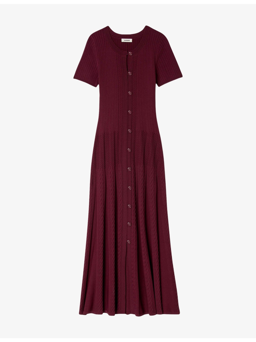 PRODUCT DETAILS - Sandro stretch-knit dress - 52% viscose, 46% polyamide, 2% elastane - Exposed button fastening at front - Slim fit, round neck, short sleeves, flared skirt, gold-tone hardware - Hand wash - True to size - Model is 5ft 10in/1.78m and wears a size UK 8 - Midweight, slight stretch Ref: R04490609