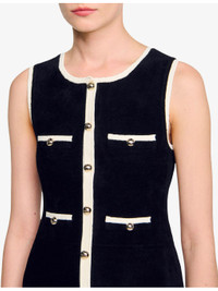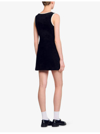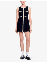 PRODUCT DETAILS - Sandro stretch-velvet dress - 56% polyamide, 43% viscose, 1% elastane - Exposed button fastening at front - Slim fit, round neck, button down design, contrast trim, decorative welt pockets - Hand wash - True to size - Model is 5ft 9in/1.75m and wears a size UK 8 - Midweight, slight-stretch Ref: R04501153
