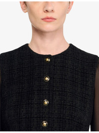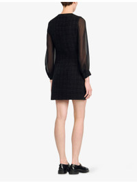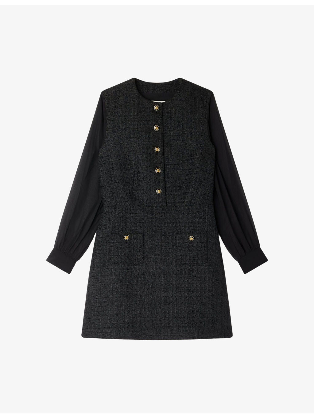 PRODUCT DETAILS - Sandro woven dress - 100% polyester - Exposed button fastening at front - Slim fit, round neck, button-down design, long sleeves, all-over tweed texture, gold-tone hardware - Dry clean - True to size - Model is 5ft 9in/1.75m and wears a size UK 8 - Midweight, stretchy Ref: R04512061