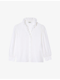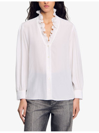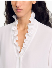 PRODUCT DETAILS - Sandro silk shirt - 100% silk - Exposed button fastening at front - Regular fit, V-neck with ruffle trim, long sleeves, buttoned cuffs - Hand wash - True to size - Model is 5ft 10in/1.78m and wears a size UK 8 - Lightweight, non-stretch Ref: R04320629