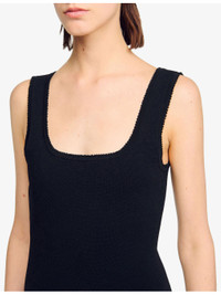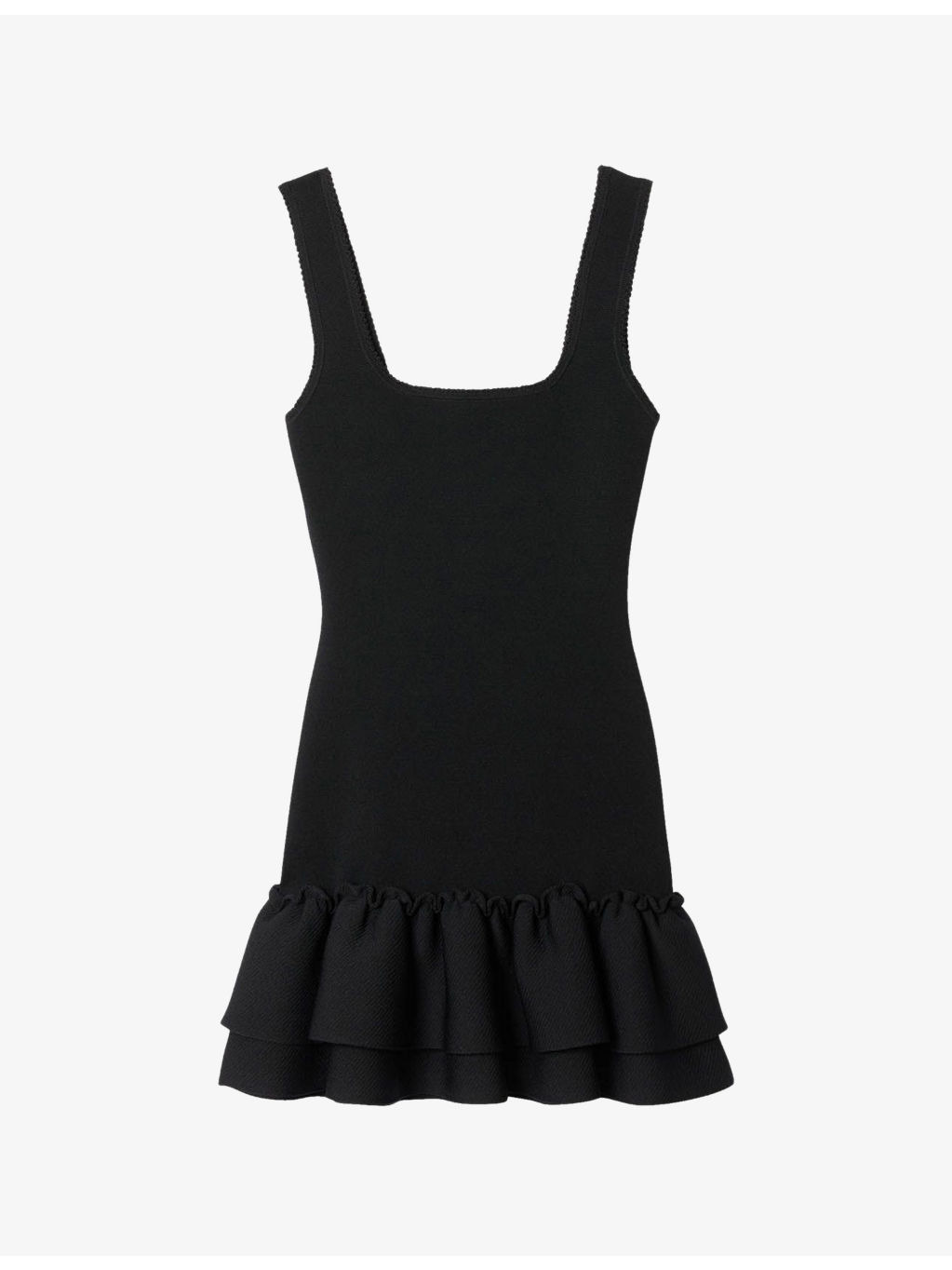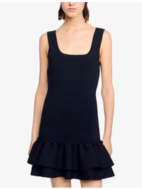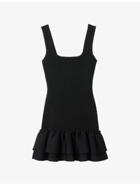 PRODUCT DETAILS - Sandro stretch-knit mini dress - 54% viscose, 44% polyamide, 2% elastane; ruffle 51% polyamide, 48% viscose, 1% elastane - Slim fit, square neck, sleeveless, wide straps, all-over knitted, contrasting double ruffle to hem, mini length - Hand wash - True to size - Model is 5ft 10in/1.78m and wears a size UK 8 - Lightweight, slight stretch Ref: R04412213