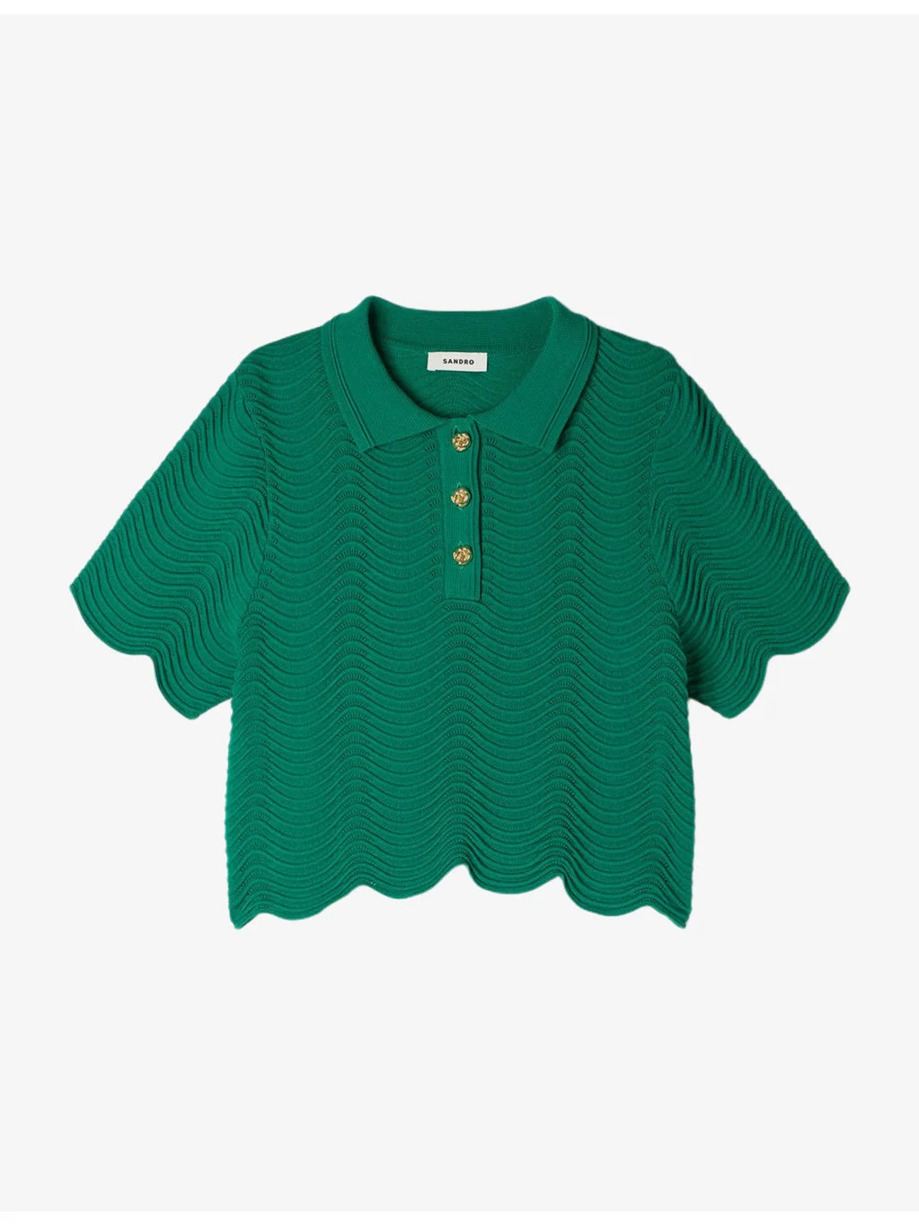 PRODUCT DETAILS - Sandro stretch-knit polo shirt - 57% viscose, 42% polyamide, 1% elastane - Exposed button fastening at front - Relaxed fit, polo collar, short sleeves, all-over decorative knit, scalloped trim to cuffs and hem, cropped hem - Hand wash - True to size - Model is 5ft 9in/1.75m and wears a size UK 8 - Midweight, slight stretch Ref: R04598495