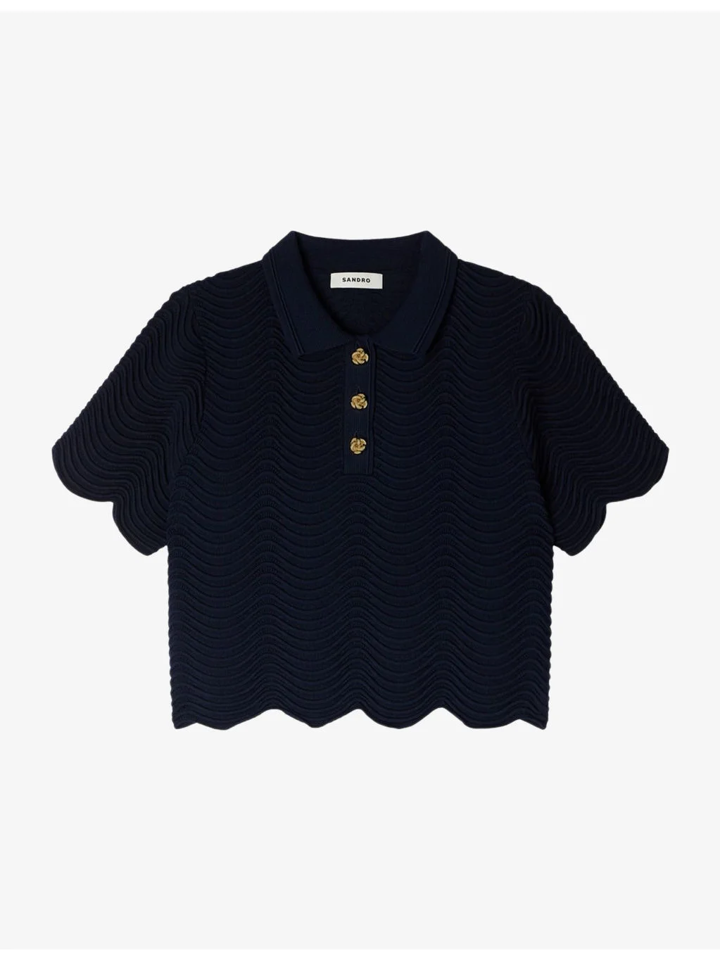 PRODUCT DETAILS - Sandro stretch-knit polo shirt - 57% viscose, 42% polyamide, 1% elastane - Exposed button fastening at front - Relaxed fit, polo collar, short sleeves, all-over decorative knit, scalloped trim to cuffs and hem, cropped hem - Hand wash - True to size - Model is 5ft 9in/1.75m and wears a size UK 8 - Midweight, slight stretch Ref: R04598495