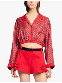 PRODUCT DETAILS - Sandro woven shirt - 100% viscose - Exposed button fastening at front - Relaxed fit, Cuban collar, V-neck, long sleeves, all-over scarf print - Dry clean only - True to size - Model is 5ft 9in/1.75m and wears a size UK 8 - Lightweight, non-stretch Ref: R04490627