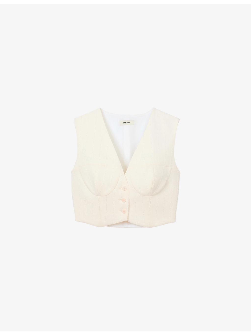 PRODUCT DETAILS - Sandro woven top - 95% viscose, 3% polyamide, 2% polyester - Button fastening - Regular fit, V-neck, sleeveless, sequin-embellished striped pattern, cropped - Dry clean - True to size - Model is 5ft 10in/1.78m and wears a size UK 8 - Lightweight, non-stretch Ref: R04415643