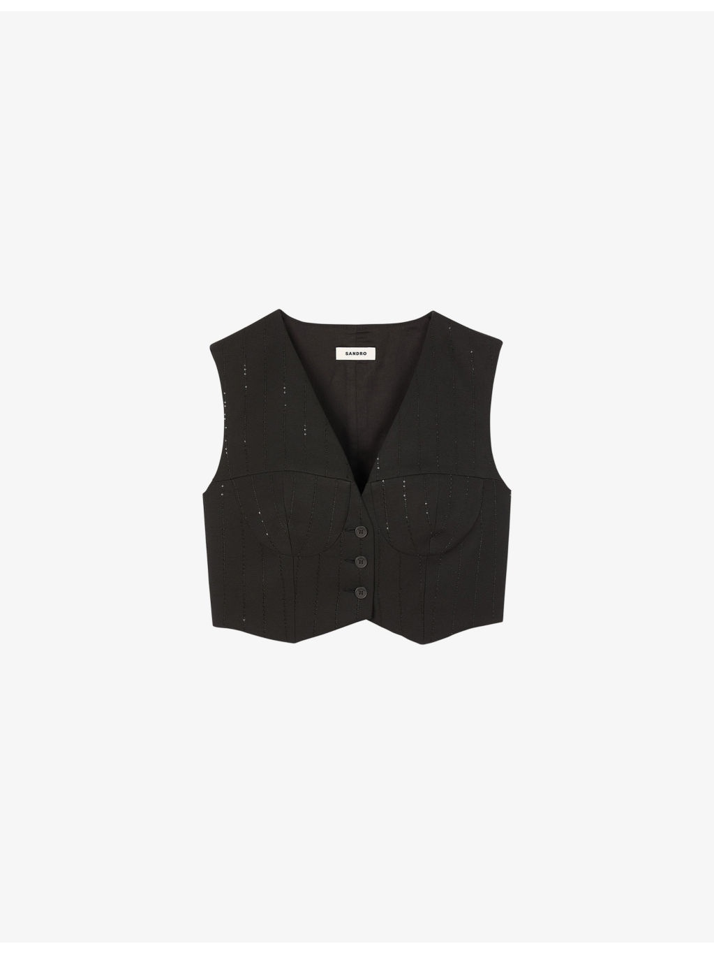 PRODUCT DETAILS - Sandro woven top - 95% viscose, 3% polyamide, 2% polyester - Button fastening - Regular fit, V-neck, sleeveless, sequin-embellished striped pattern, cropped - Dry clean - True to size - Model is 5ft 10in/1.78m and wears a size UK 8 - Lightweight, non-stretch Ref: R04415592