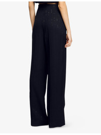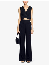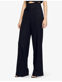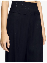 PRODUCT DETAILS - Sandro woven trousers - 98% viscose, 2% polyamide; belt lining 100% cotton - Concealed zip fastening at side - Regular fit, high rise, straight leg, structured waistband, two front flap welt pockets, pressed creases, vertical stripes and tonal sequin embellishments - Specialist dry clean only - True to size - Midweight, non-stretch Ref: R04415591