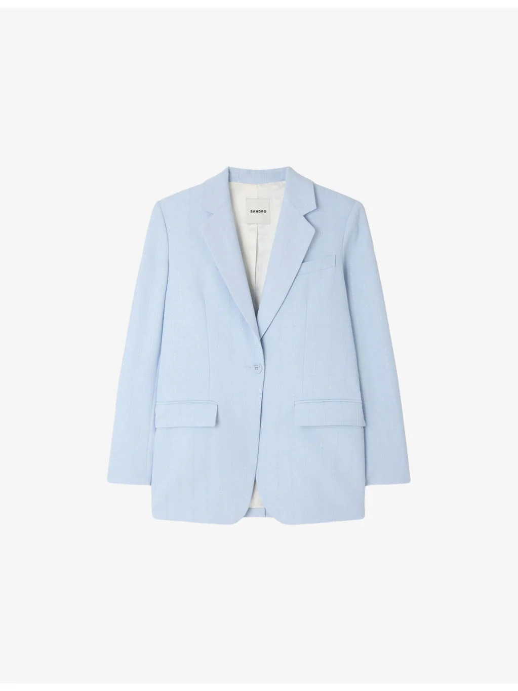 PRODUCT DETAILS - Sandro woven blazer - 98% viscose, 2% polyamide; lining 100% viscose; sequins 100% polyester; under collar 100% polyester; pocket lining 100% cotton - Exposed button fastening at front - Regular fit, single-breasted, notch lapels, padded shoulders, long sleeves, buttoned cuffs, one chest welt pocket, two front flap pockets, all-over stripe pattern, all-over sequin embellishments - Specialist dry clean - True to size - Midweight, non-stretch Ref: R04578782
