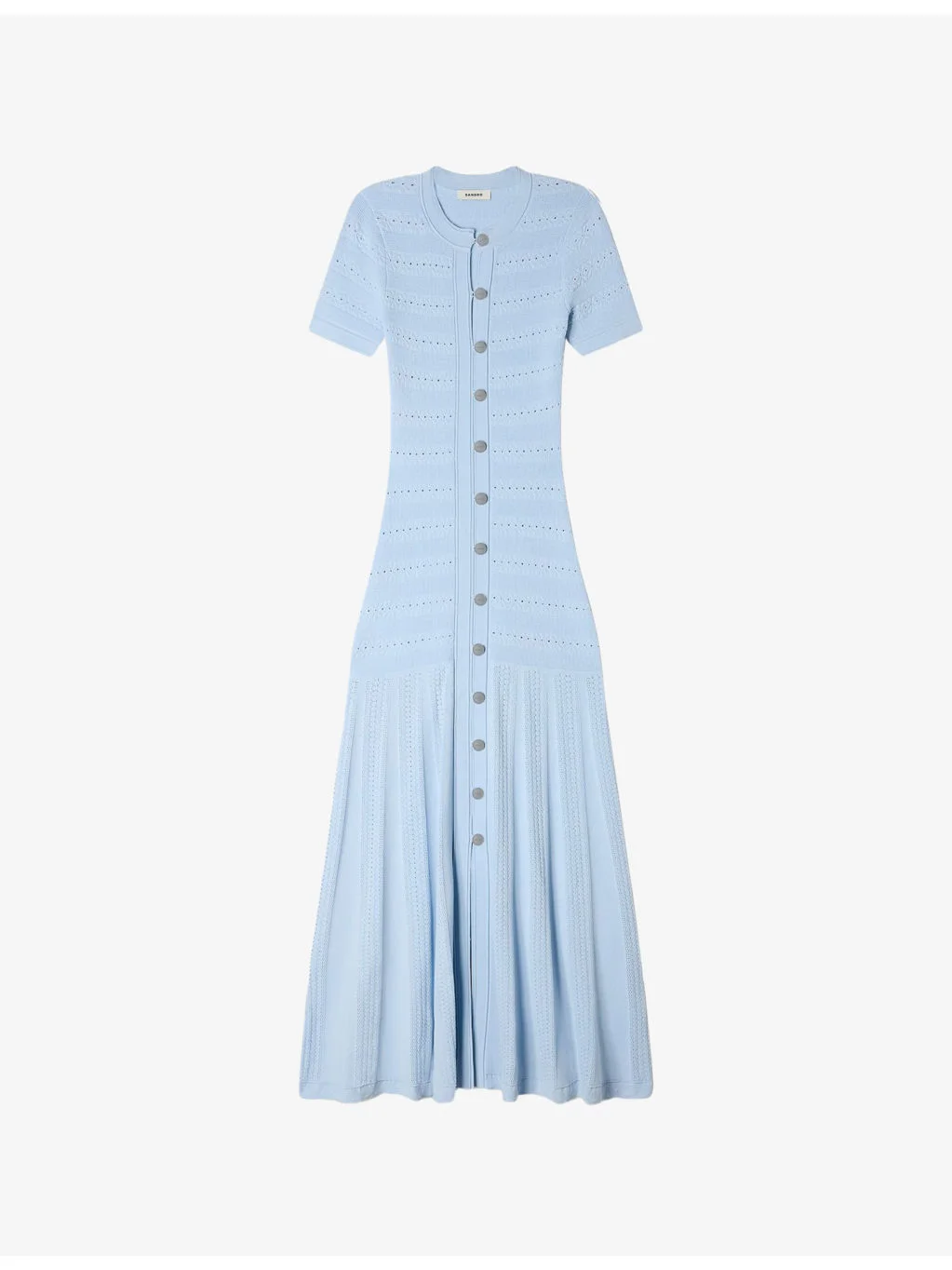 PRODUCT DETAILS - Sandro knitted maxi dress - 52% viscose, 46% polyamide, 2% elastane - Button fastening - Slim fit, round-neck, short sleeves, flared skirt, textured finish - Hand wash - True to size - Model is 5ft 11in/1.80m and wears a size UK 8 - Lightweight, slight stretch Ref: R04598511