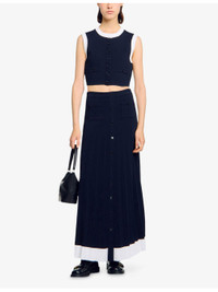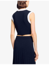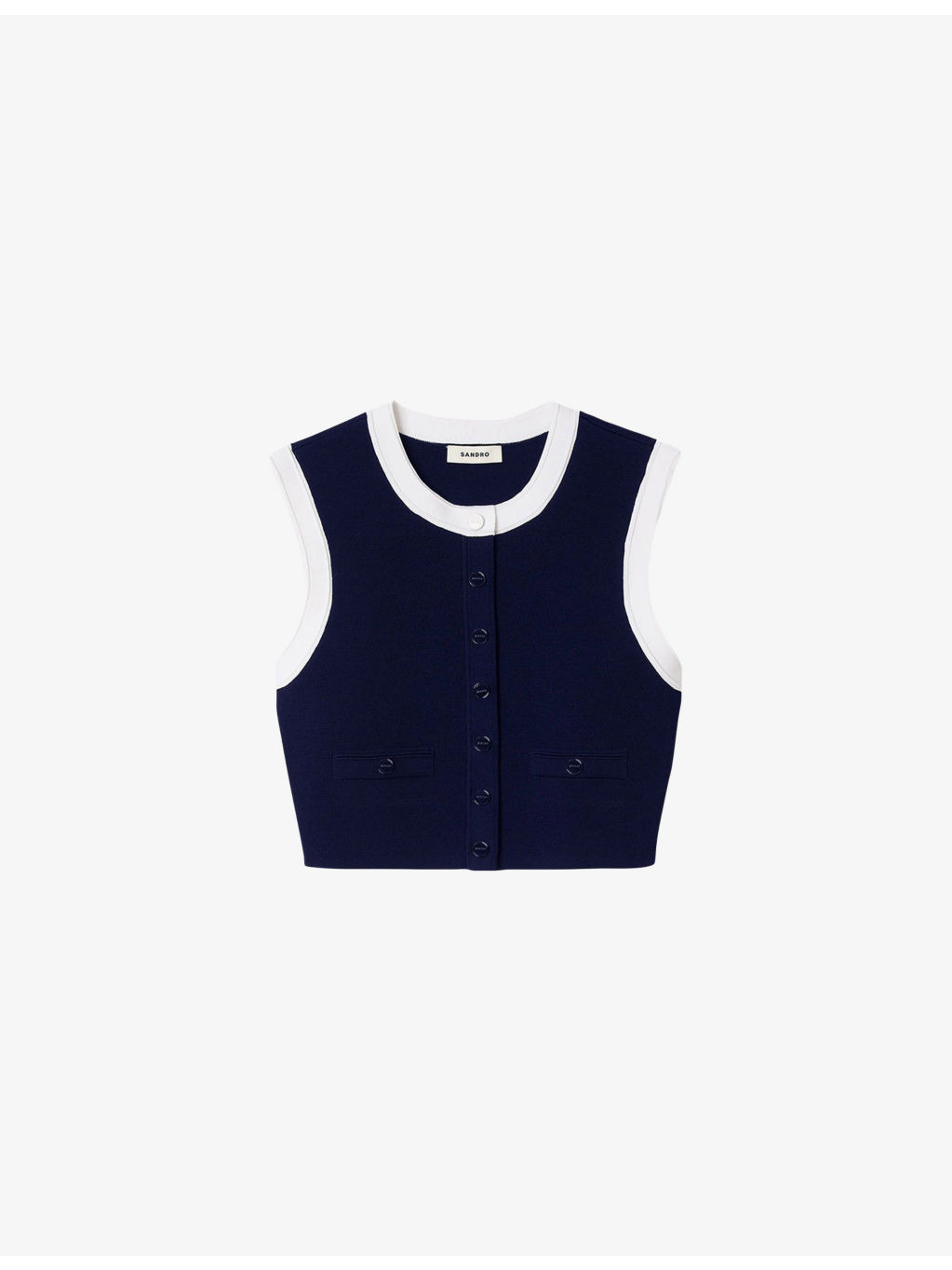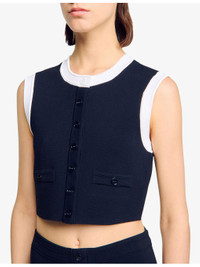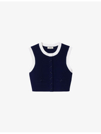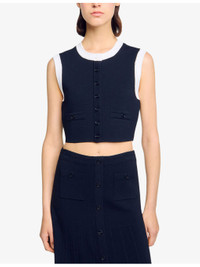 PRODUCT DETAILS - Sandro knitted cardigan - 52% viscose, 45% polyamide, 3% elastane - Button fastening - Regular fit, round-neck, sleeveless, decorative pockets, contrast trim, cropped - Hand wash - True to size - Model is 5ft 9in/1.75m and wears a size UK 8 - Midweight, slight stretch Ref: R04490589