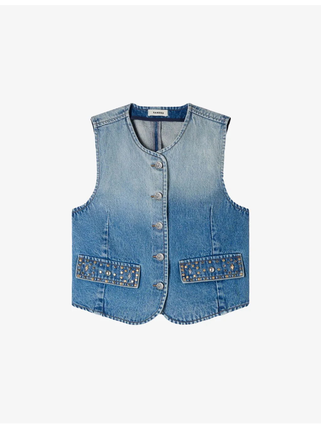 PRODUCT DETAILS - Sandro denim jacket - 100% cotton - Button fastening - Regular fit, round-neck, sleeveless, side pockets with studded trim, faded wash, cropped - Machine wash mild - True to size - Model is 5ft 9in/1.75m and wears a size UK 8 - Midweight, non-stretch Ref: R04578739