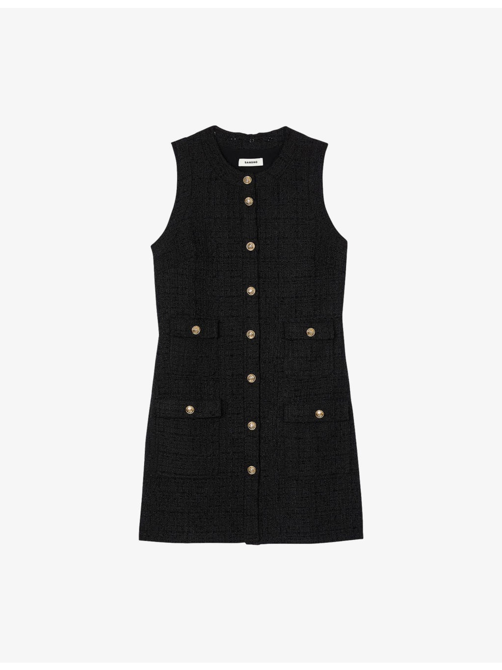 PRODUCT DETAILS - Sandro woven mini dress - 100% polyester; lining 100% polyester - Exposed button fastening at front - Round neck, sleeveless, four flap pockets at front, gold-toned hardware, shift dress style. mini length - Specialist dry clean only - True to size - Midweight, non-stretch Ref: R04341858