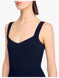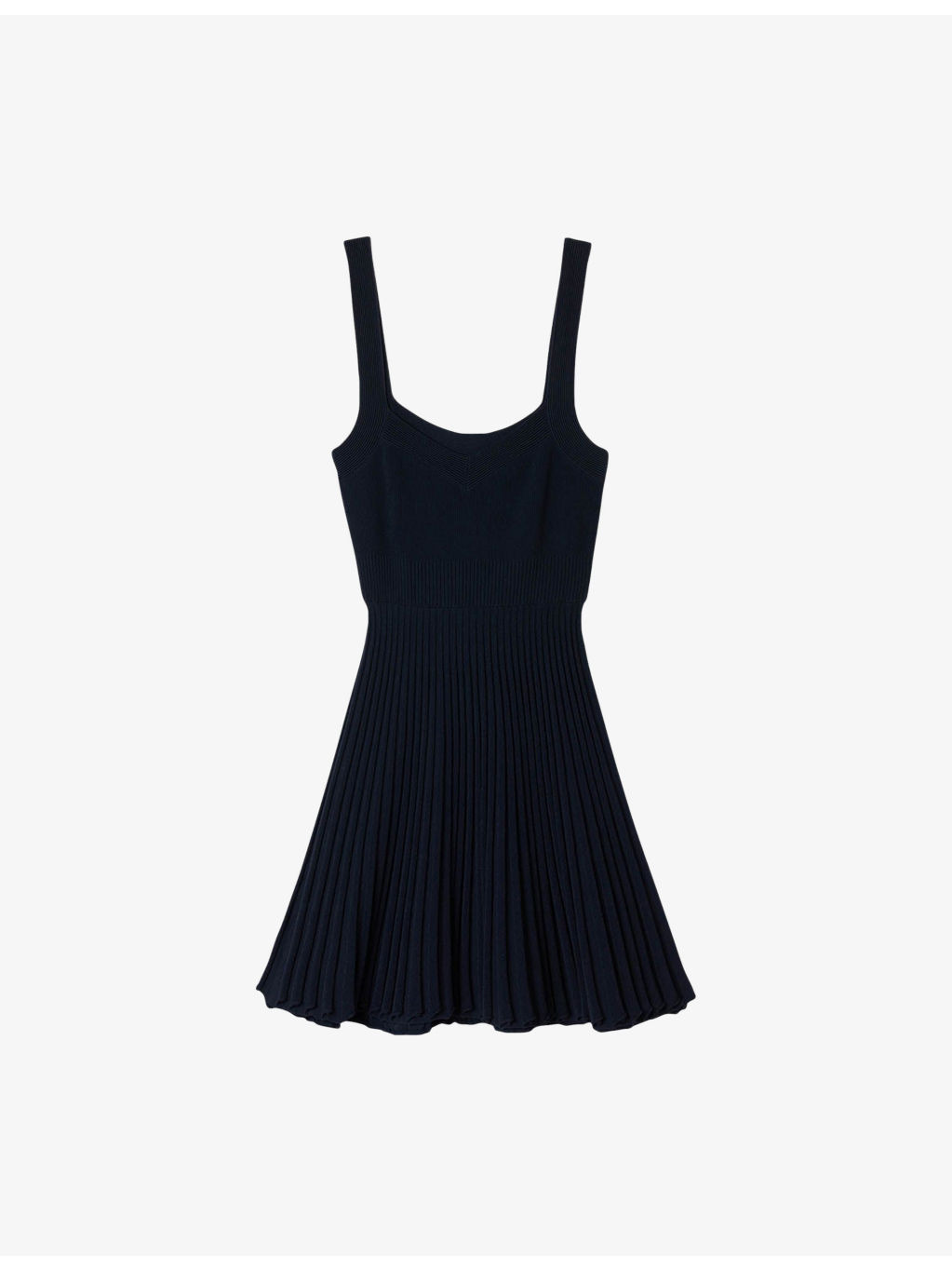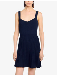 PRODUCT DETAILS - Sandro knitted mini dress - 61% viscose, 21% polyamide, 15% polyester, 3% elastane; skirt 61% viscose, 22% polyamide, 14% polyester, 3% elastane; band 81% viscose, 19% polyester; strap 79% viscose, 21% polyester - Regular fit, sweetheart neckline, sleeveless, pleated flared skirt, mini length - Hand wash - True to size - Lightweight, non-stretch Ref: R04490548