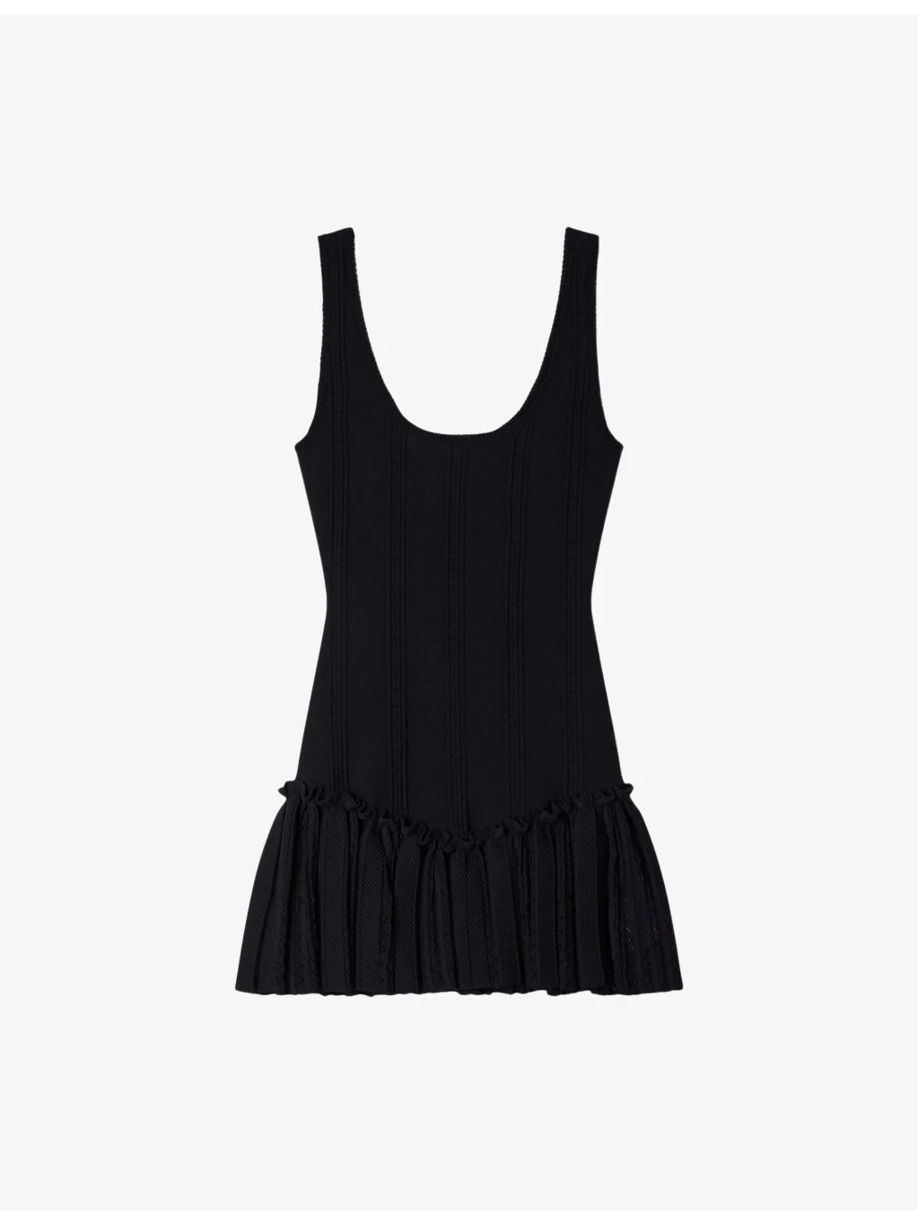 PRODUCT DETAILS - Sandro knitted mini dress - 55% polyamide, 42% viscose, 3% elastane - Slim fit, scoop-neck, sleeveless, ruffle hem - Hand wash - True to size - Model is 5ft 11in/1.80m and wears a size UK 8 - Lightweight, slight stretch Ref: R04618182