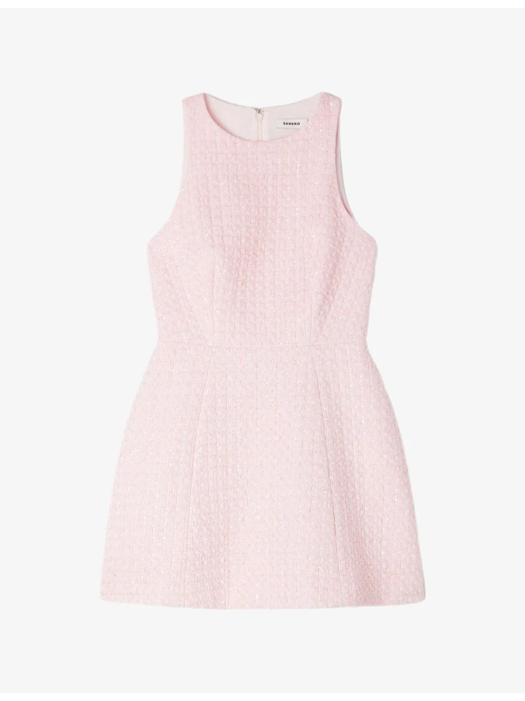 PRODUCT DETAILS - Sandro tweed mini dress - 100% polyester - Zip fastening - Slim fit, round-neck, sleeveless, flared skirt, all-over sequin embellishment - Dry clean - True to size - Model is 5ft 9in/1.75m and wears a size UK 8 - Midweight, non-stretch Ref: R04578662
