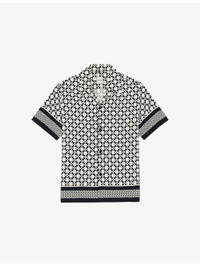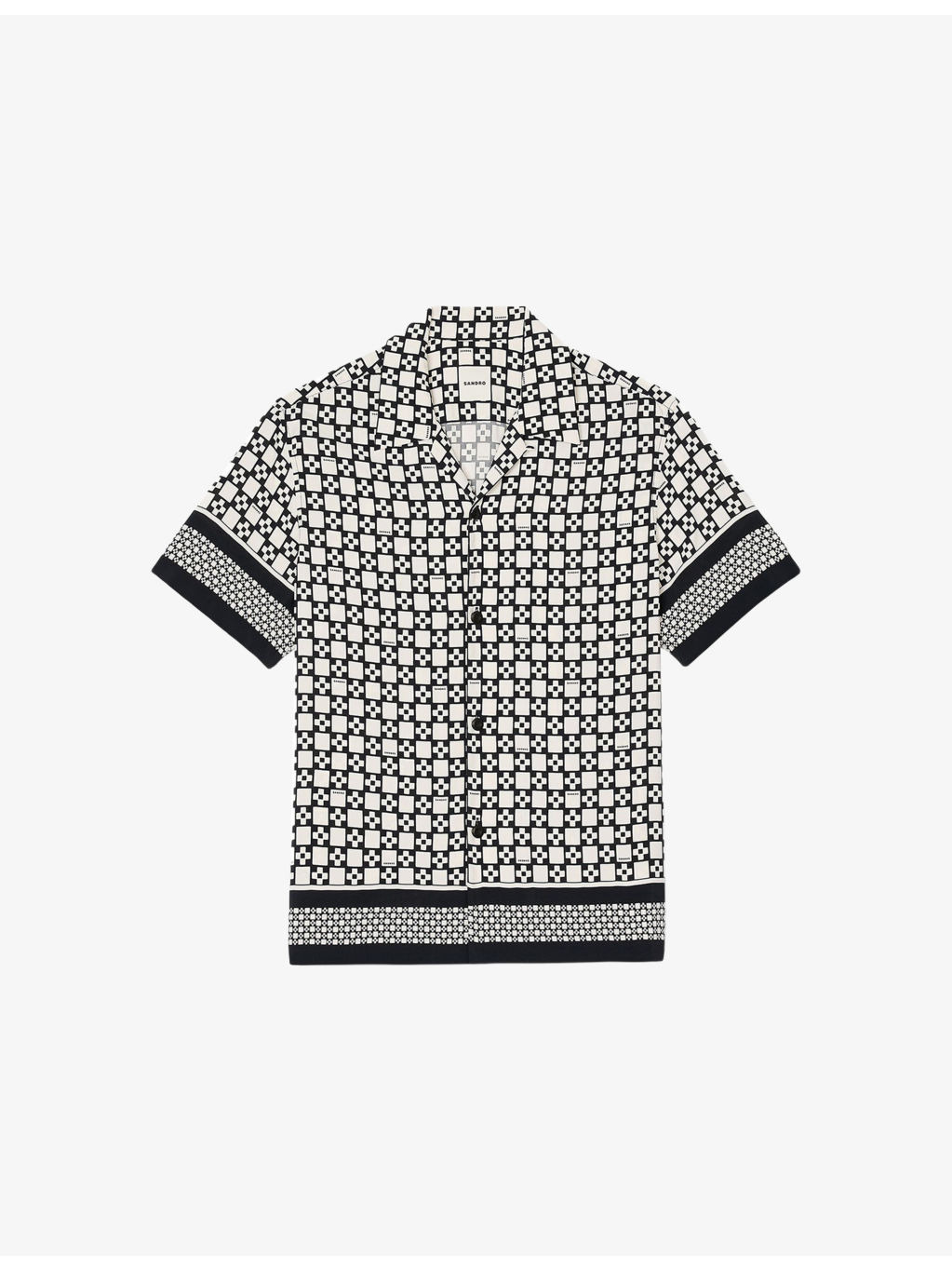 PRODUCT DETAILS - Sandro satin shirt - 100% viscose - Exposed button fastenings at front - Loose fit, shark collar, dropped shoulders, short sleeves, all-over square cross motif, contrasting striped edges - Hand wash - Lightweight, non-stretch Ref: R04411921