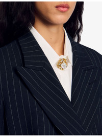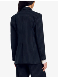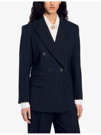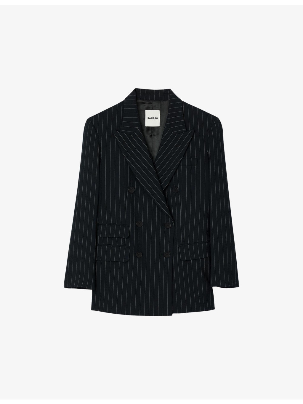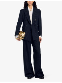 PRODUCT DETAILS - Sandro woven blazer - 54% polyester, 44% wool, 2% elastane; lining 100% viscose; under collar 100% polyester; pocket lining 100% cotton - Exposed button fastening at front - Peak lapels, long sleeves, buttoned cuffs, double breasted, one welt pocket at chest, three flap pockets at sides, all-over stripe pattern, single vent at back hem - Dry clean only - True to size - Model is 5ft 10in/1.78m and wears a size UK 8 - Midweight, non-stretch Ref: R04333740